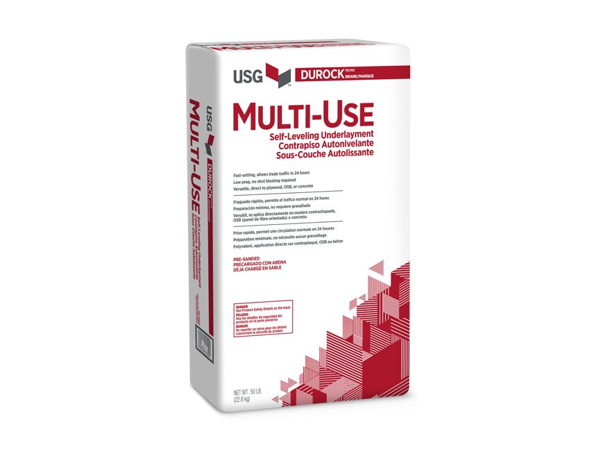 Ideal for wood frame, renovation and light commercial construction, Durock™ Brand Multi-Use Self-Leveling Underlaymentprovides high compressive strengths at minimal thicknesses. This versatile poured underlayment: